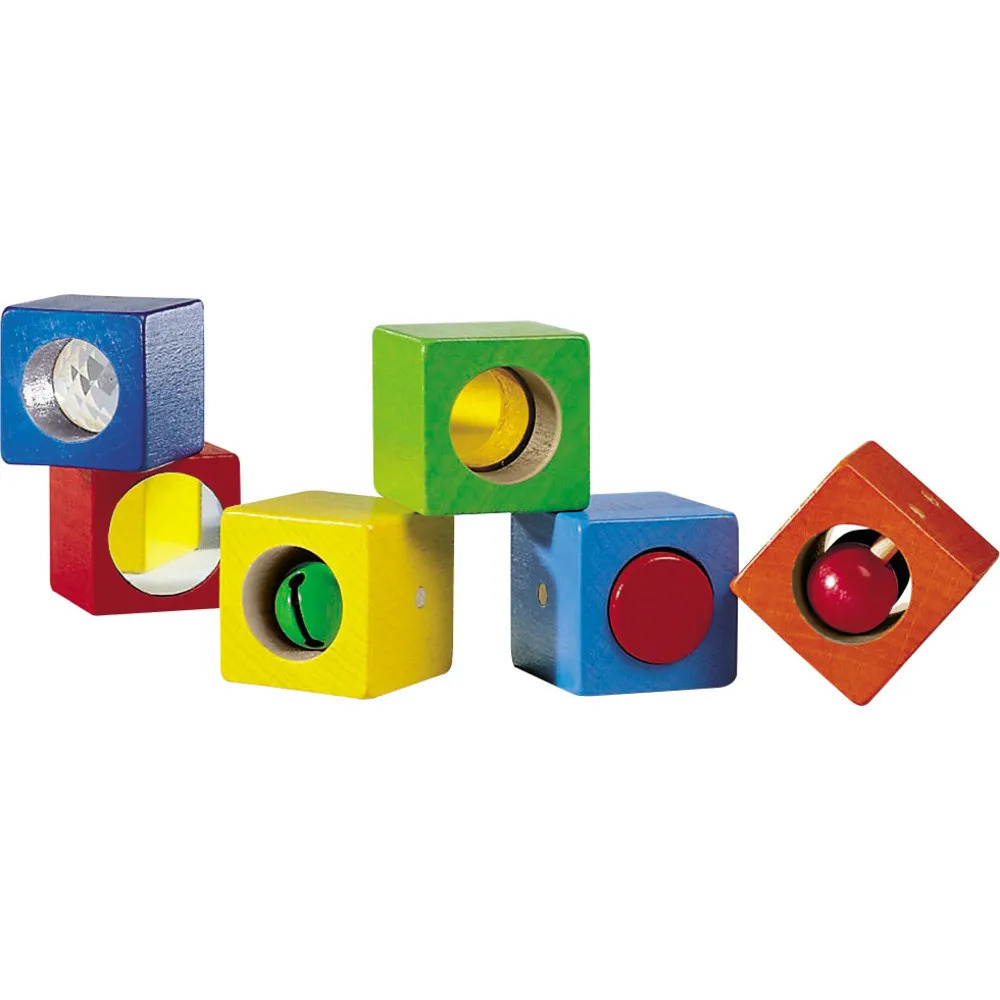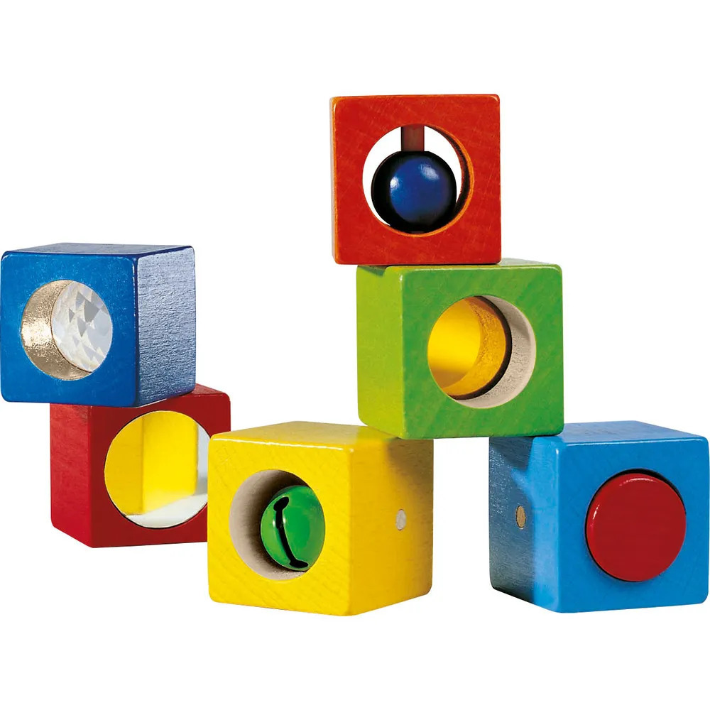 Súprava senzorických drevených kociek pre deti od 12 mesiacov. Kocky sú rôznych farieb a každá z nich ponúka vlastnú aktivitu s vizuálnym alebo zvukovým efektom – rolničku, korálku, zrkadielko či kaleidoskop. Deti sa zabavia objavovaním rôznych prekvapení a zároveň si hrou rozvíjajú jemnú motoriku a precvičujú základné zmyslové vnímanie – zrak, sluch a hmat.